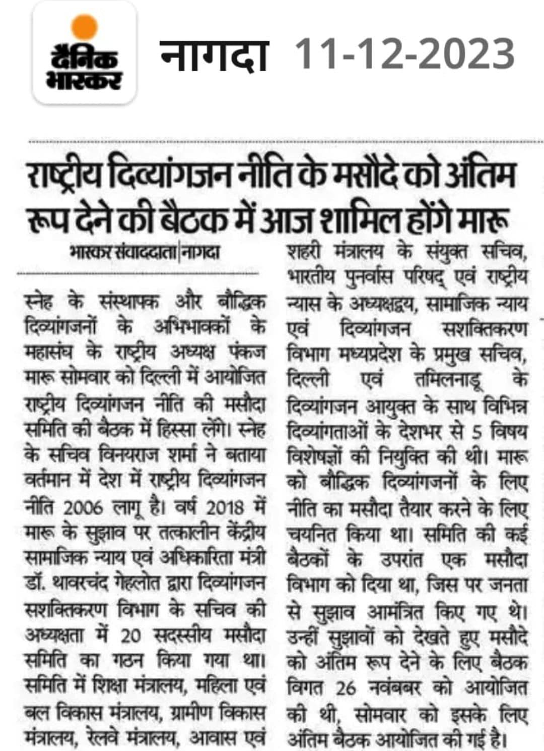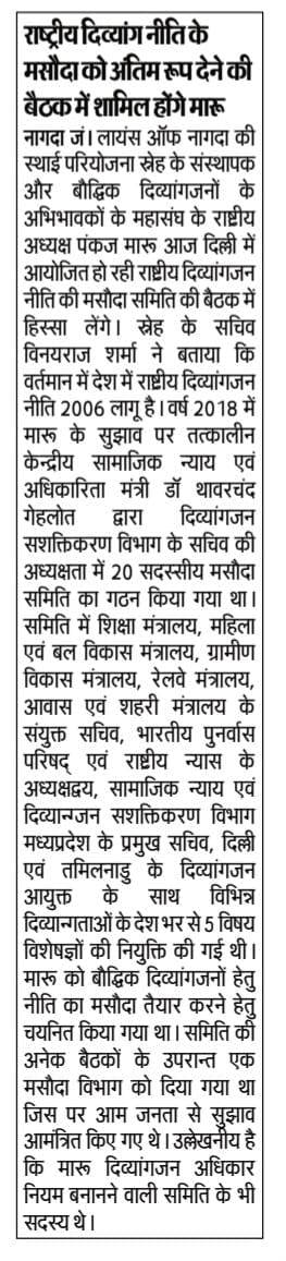 राष्ट्रीय दिव्यांग जन निति के मसौदा को अंतिम रूप देने की बैठक में शामिल होंगे मारू