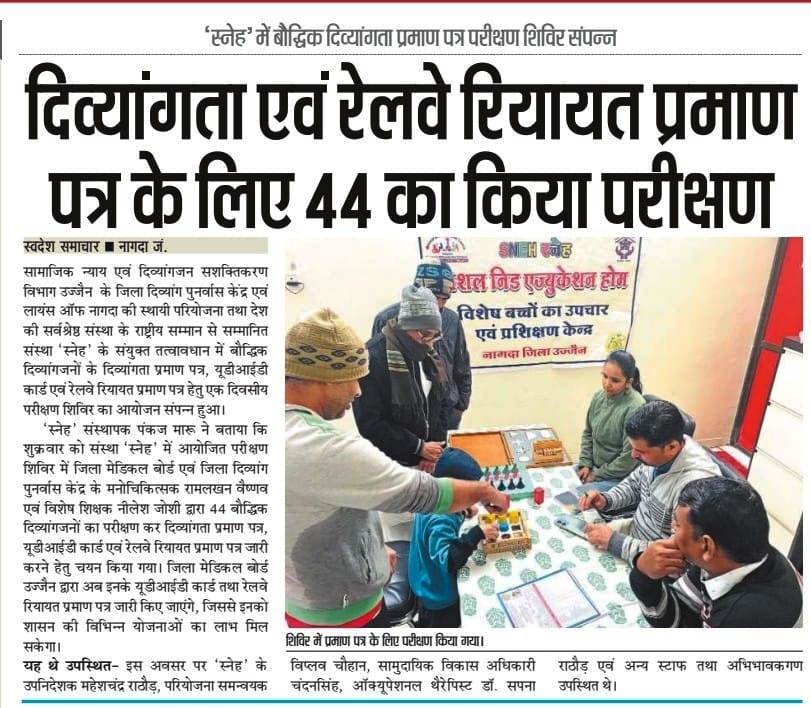 स्नेह में बौद्धिक दिव्यांगता प्रमाण पत्र परीक्षण शिविर संपन्न