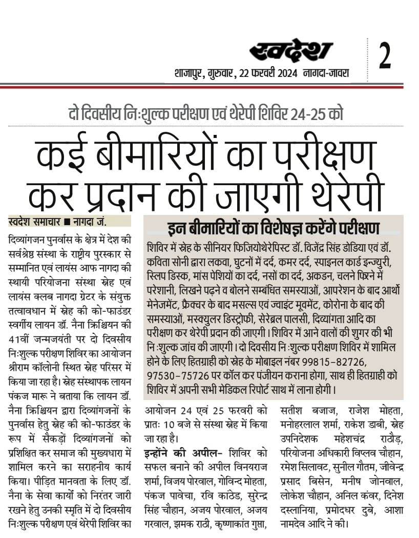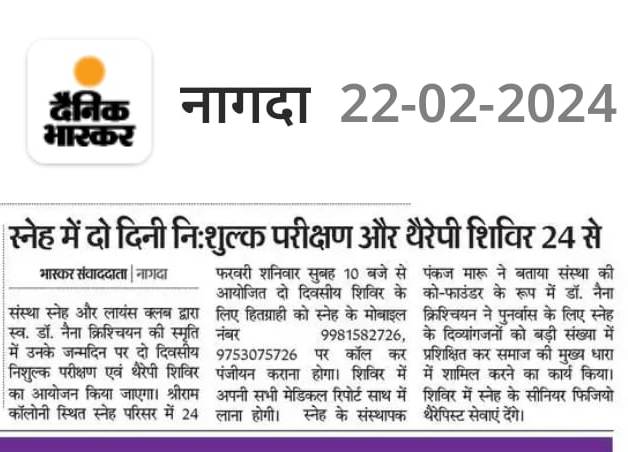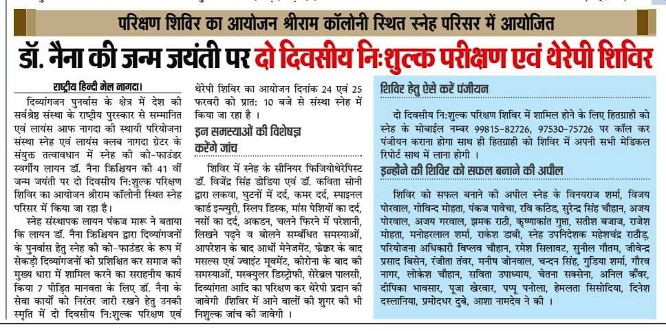 स्व. डॉ. नैना की जन्म जयंती पर दो दिवसीय नि:शुल्क परीक्षण एवं थेरेपी शिविर 24 से स्नेह में