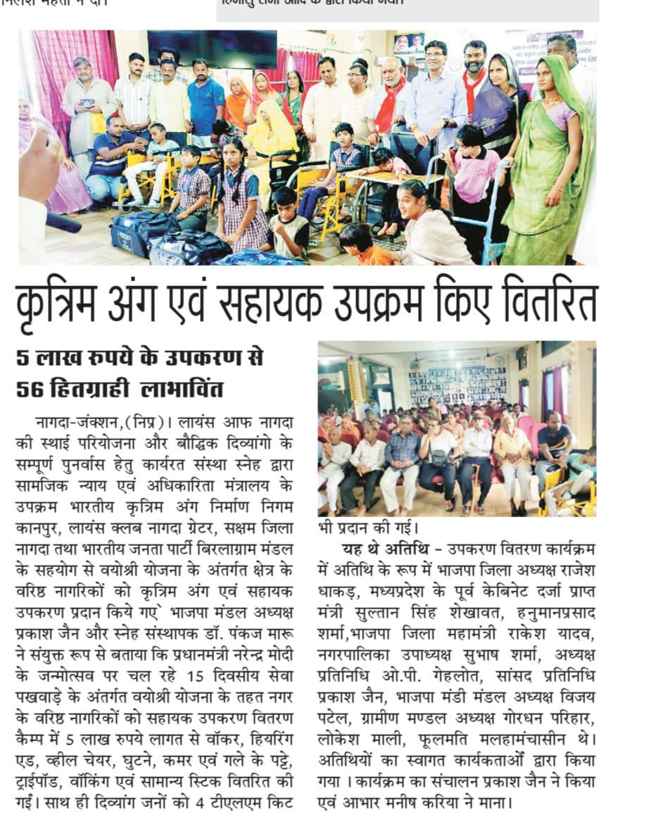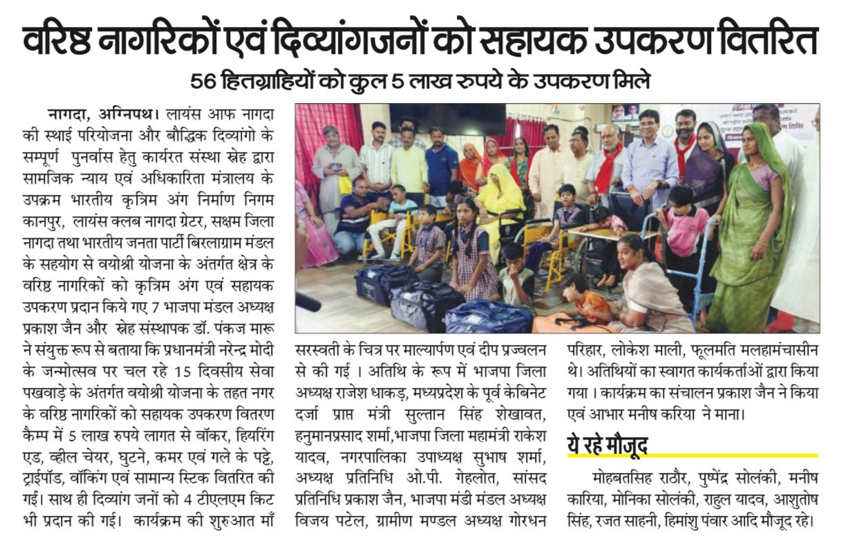 वरिष्ठ नागरिकों एवं दिव्यांगजनों को सहायक उपकरण वितरित