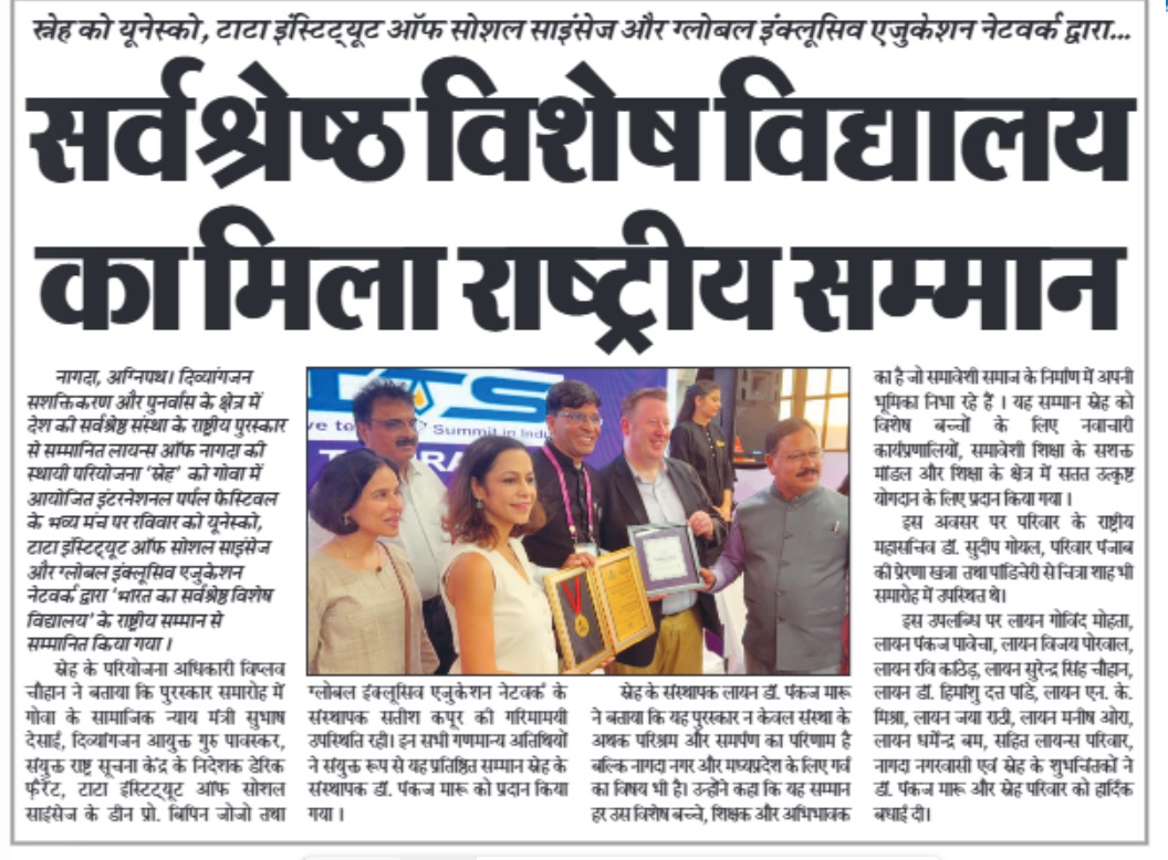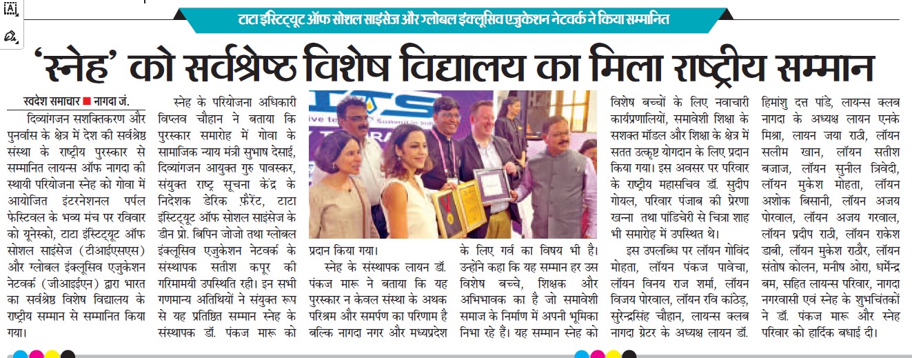 'स्नेह' को सर्वश्रेष्ठ विशेष विद्यालय का मिला राष्ट्रीय सम्मान